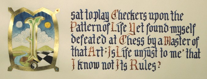 The other day I made a first attempt at a Gothic-style illuminated text with gouache, gold-leafing pen, Noodler’s Bad Belted Kingfisher (blue ink), and Platinum’s Cassis Black (red ink) on Tomoe River paper. I used a Lamy 1.5 italic nib for the text and a fine pointed brush for the gouache. Incredibly, only the gold leafing pen bled through the Tomoe paper despite multiple coats of fairly wet gouache. The text is my composition.