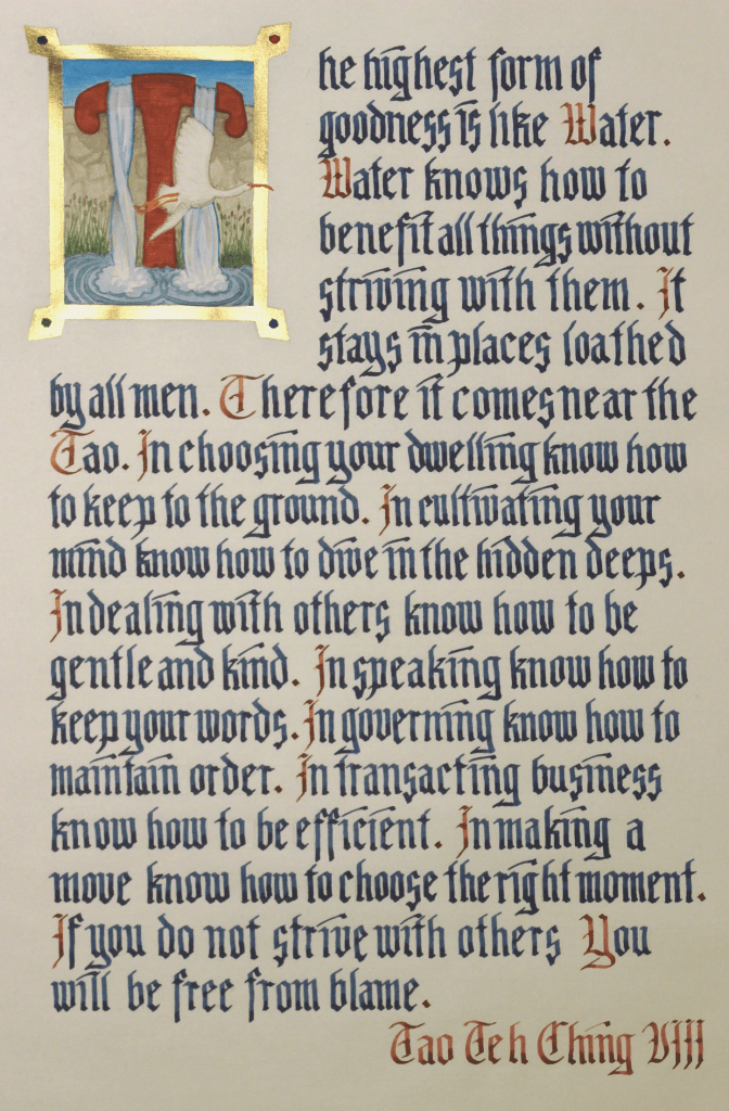 Here’s a second piece of Gothic calligraphy, this one based on Dr. John C. H. Wu’s translation of the Tao Teh Ching. I made this using gouche, gold leafing pen and ink (Noodler’s Bad Belted Kingfisher and Platinum’s Cassis Black) on Tomoe River paper. The ibis has been a symbol of writers since ancient Egyptian times, and here he bursts the frame to take the nourishment of water into the airs of the writerly mind.