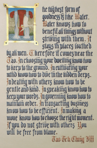 The Highest Form of Goodness March 4, 2018March 4, 2018 / owensheppard Gothic calligraphy transcribed from Dr. John C. H. Wu’s translation of the Tao Teh Ching.